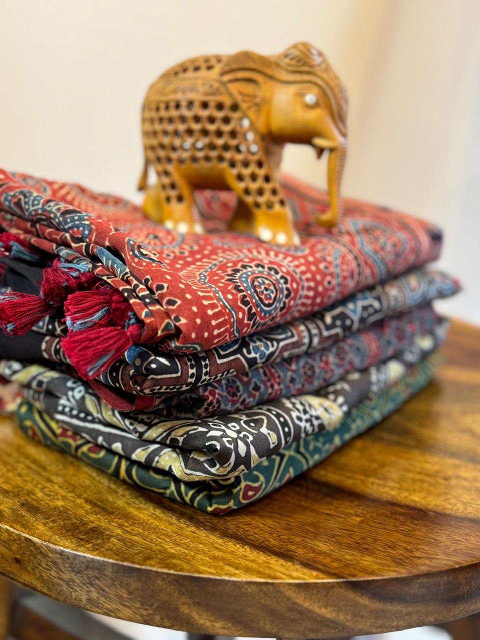 Each dupatta undergoes a multi-step resist dyeing process using only natural elements like indigo, jaggery, and alum, resulting in deep, rich colors and a unique earthy fragrance. Whether paired with a simple kurta or layered over an ethnic ensemble, this Ajrakh dupatta adds a bold, artistic statement to any look.